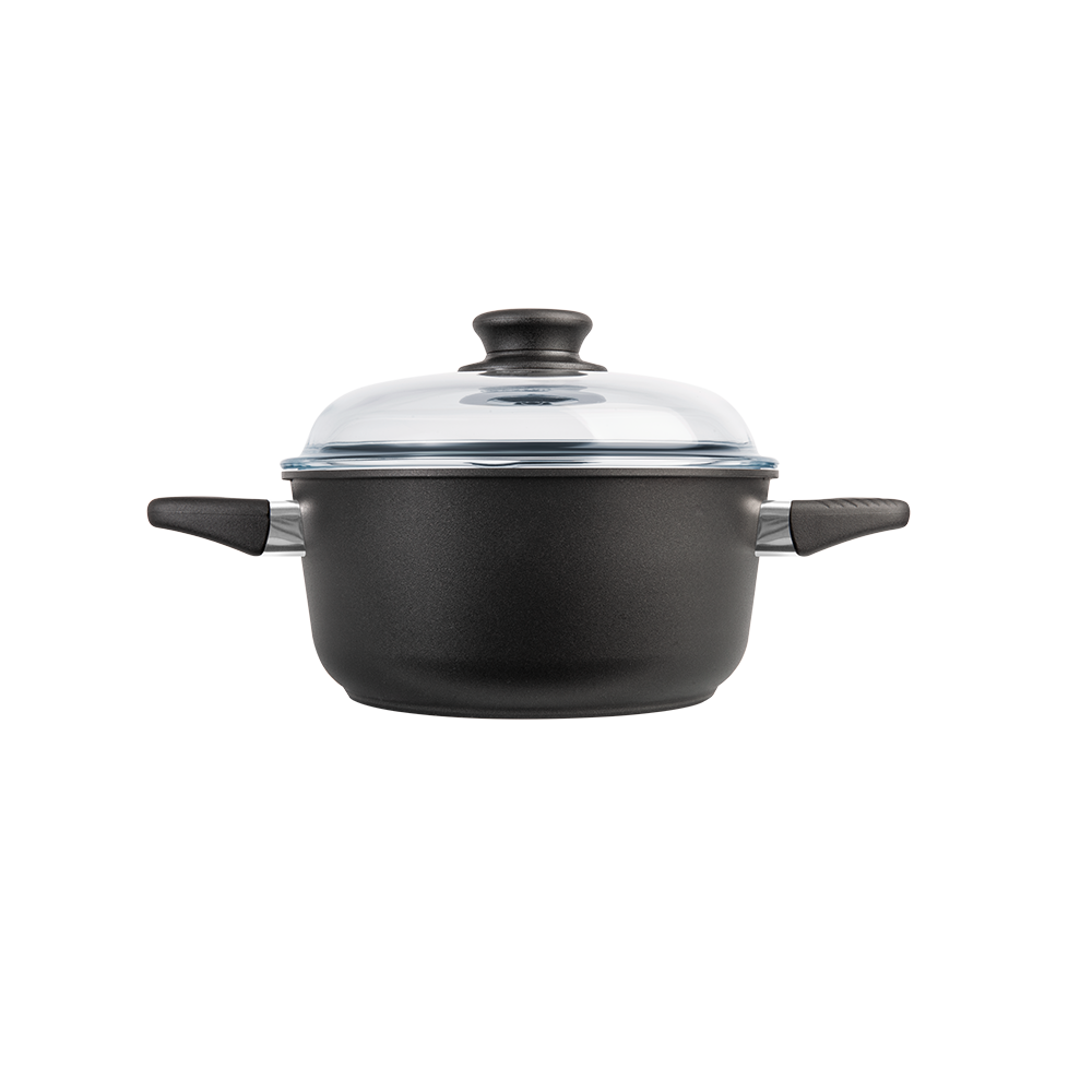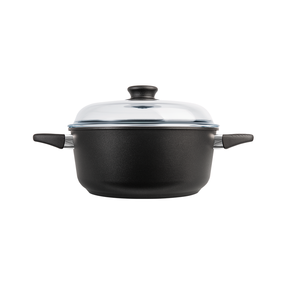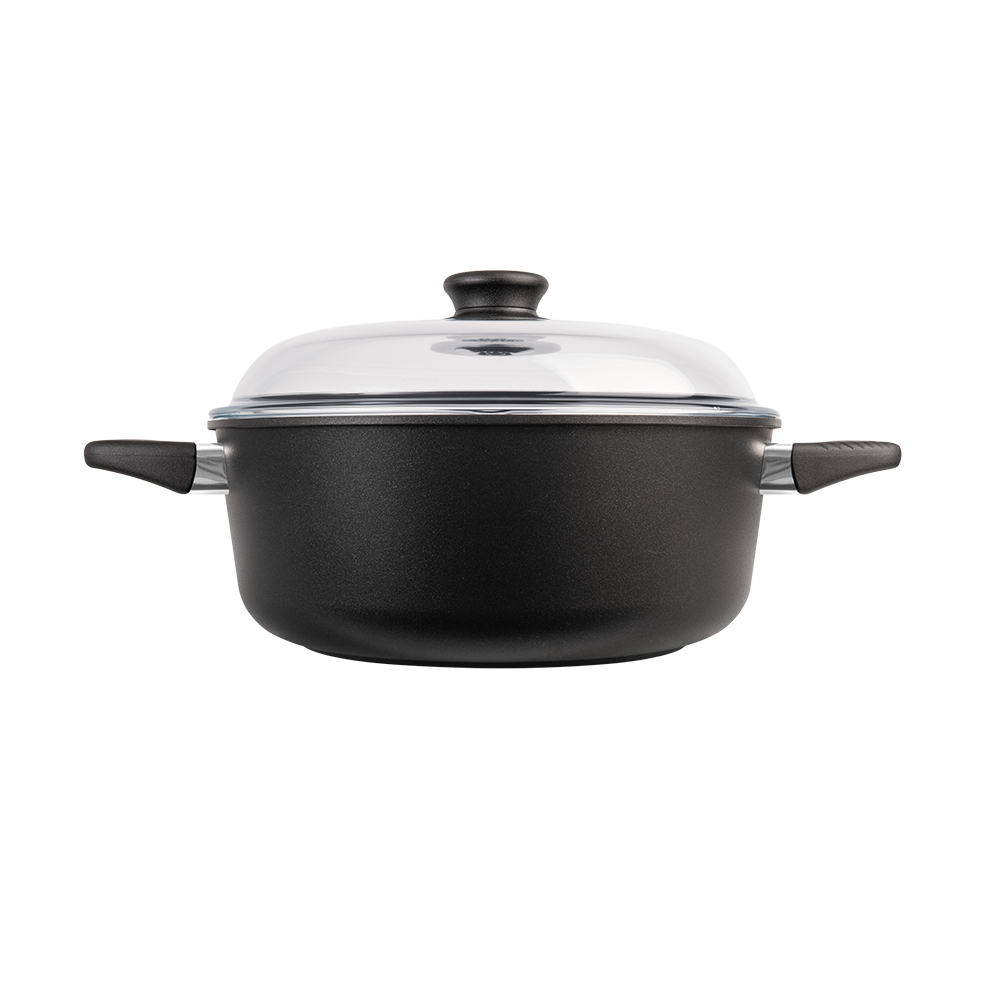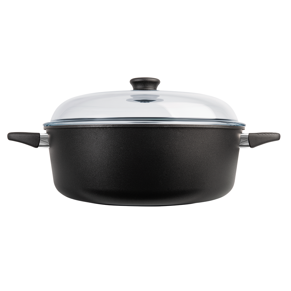 En premium stekgryta i flera storlekar med patenterad Biotan-beläggning, 8 mm tjock botten och tillverkad av återvunnen svensk aluminium – för hållbar och problemfri matlagning varje dag.