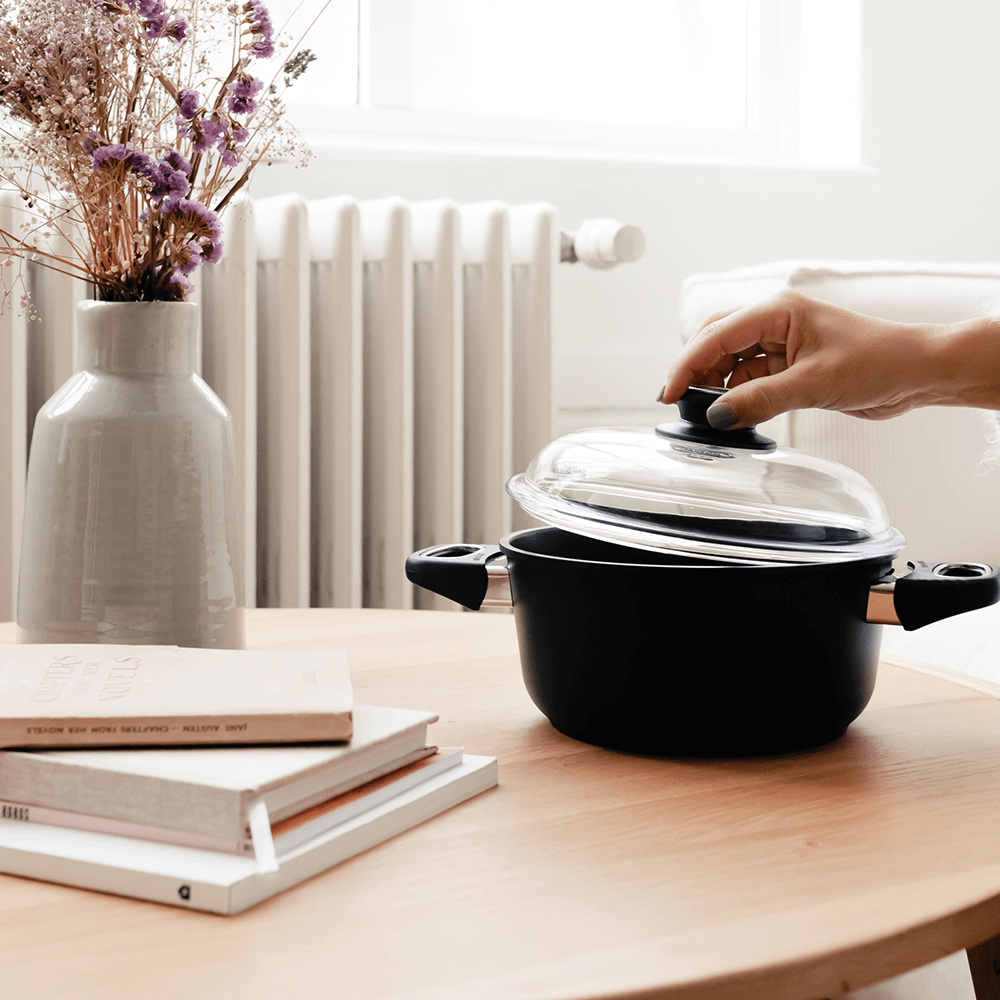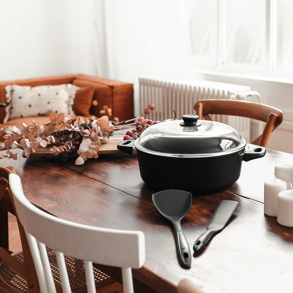 Den 8 mm tjocka thermoplanbottnen säkerställer optimal värmefördelning och att grytan alltid är helt plan i botten. Den slår sig inte och behåller sin form över tid – även vid höga temperaturer.