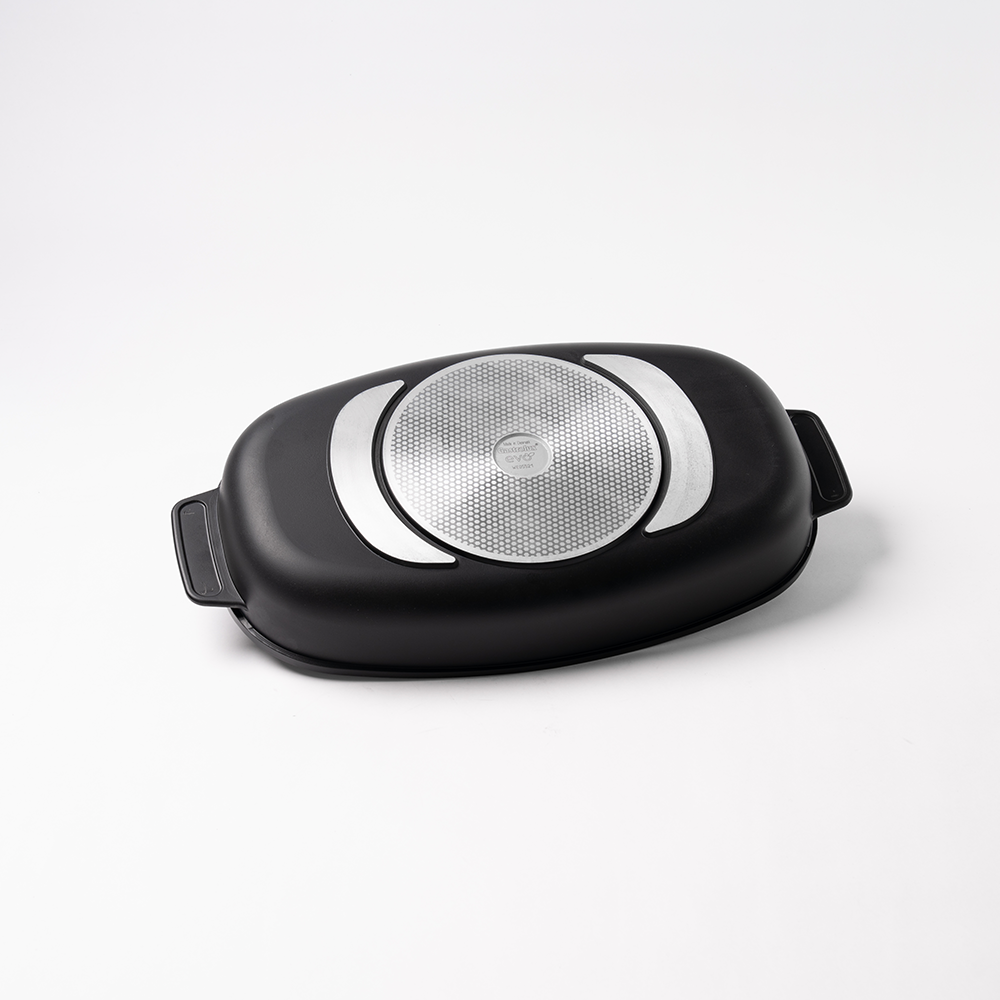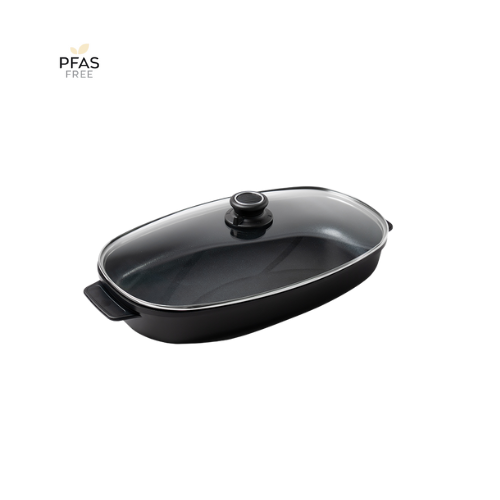 Denna EVO PFAS-fria fiskvform/stekgryta är utformat för att göra matlagningen både hälsosam, enkel och inspirerande. Den avlånga formen gör fatet perfekt för hel fisk, ugnsbakade grönsaker, gratänger och andra rätter som gärna serveras direkt från ugn till bord.
